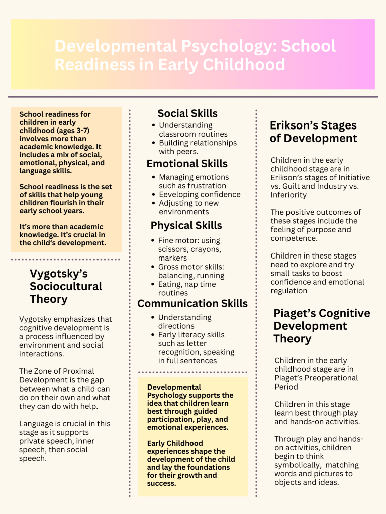 In this infographic, we present three developmental psychology theorists, Piaget, Vygotsky, and Erikson. Although their theories vary, they all emphasize the importance of hands on support from caregivers to children.