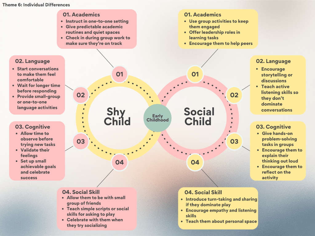 This diagram is based on our team’s interview with an experienced teacher who has worked with children ages three to seven. It highlights a variety of strategies that support the development of key academic, language, cognitive, and social skills for both shy and social children. We hope you find this information useful, and we welcome any questions you may have.